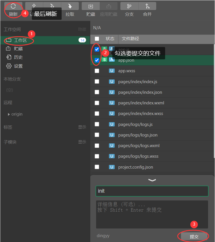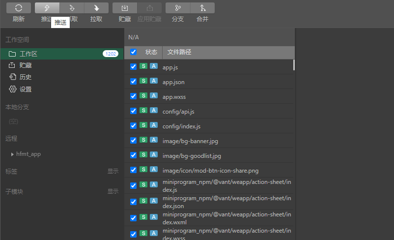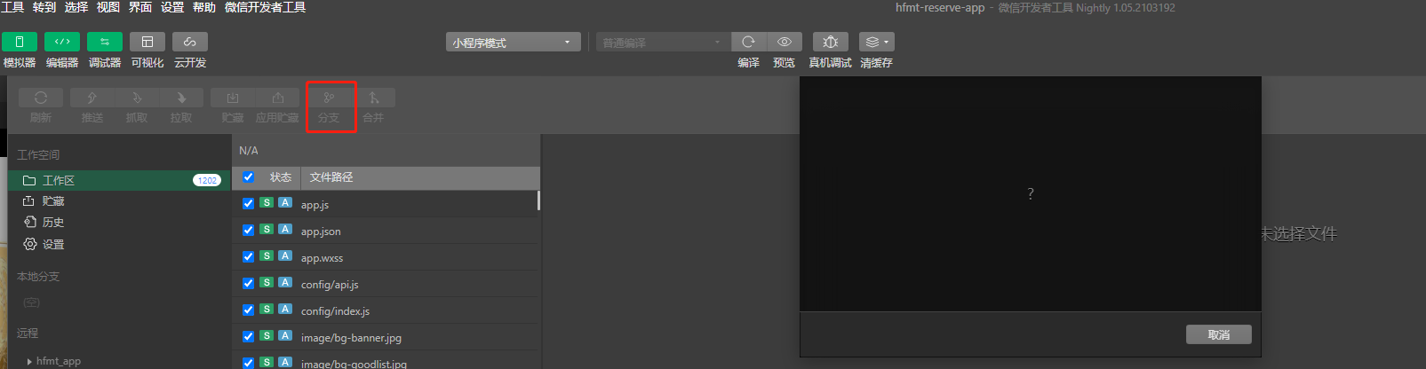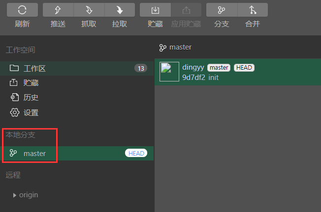因为没有本地分支的原因,可以通过提交代码来创建一个本地分支,提交代码后,点一下刷新,就有本地分支了,再点推送,就不是白屏了