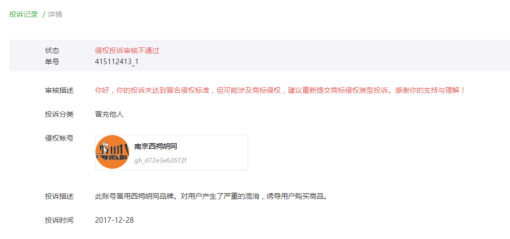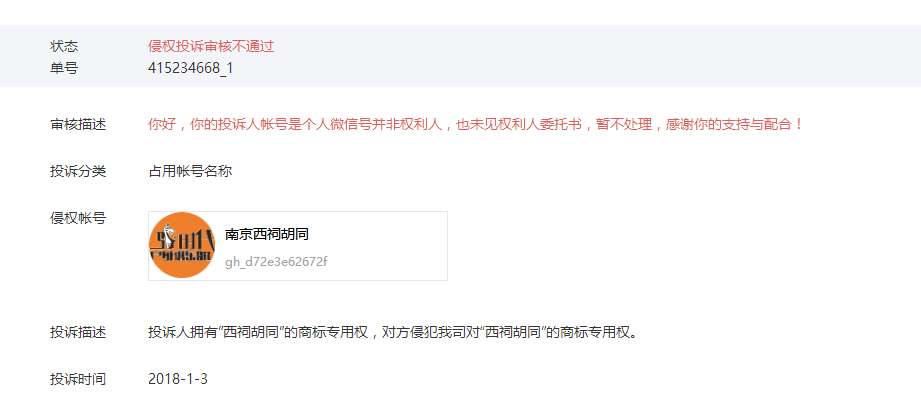 公司没有叫西祠胡同的公众号,已经用了另一个已经验证的服务号再次发起投诉,希望这次能顺利吧~