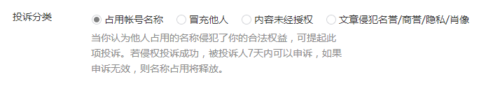 另外,用户对侵权类别判断出现误差也不应该影响投诉结果啊,再提交一遍信息,走一遍OA很累哒。。。我们普通用户也很难判断占用账号名称和冒充他人的区别啊,衰~