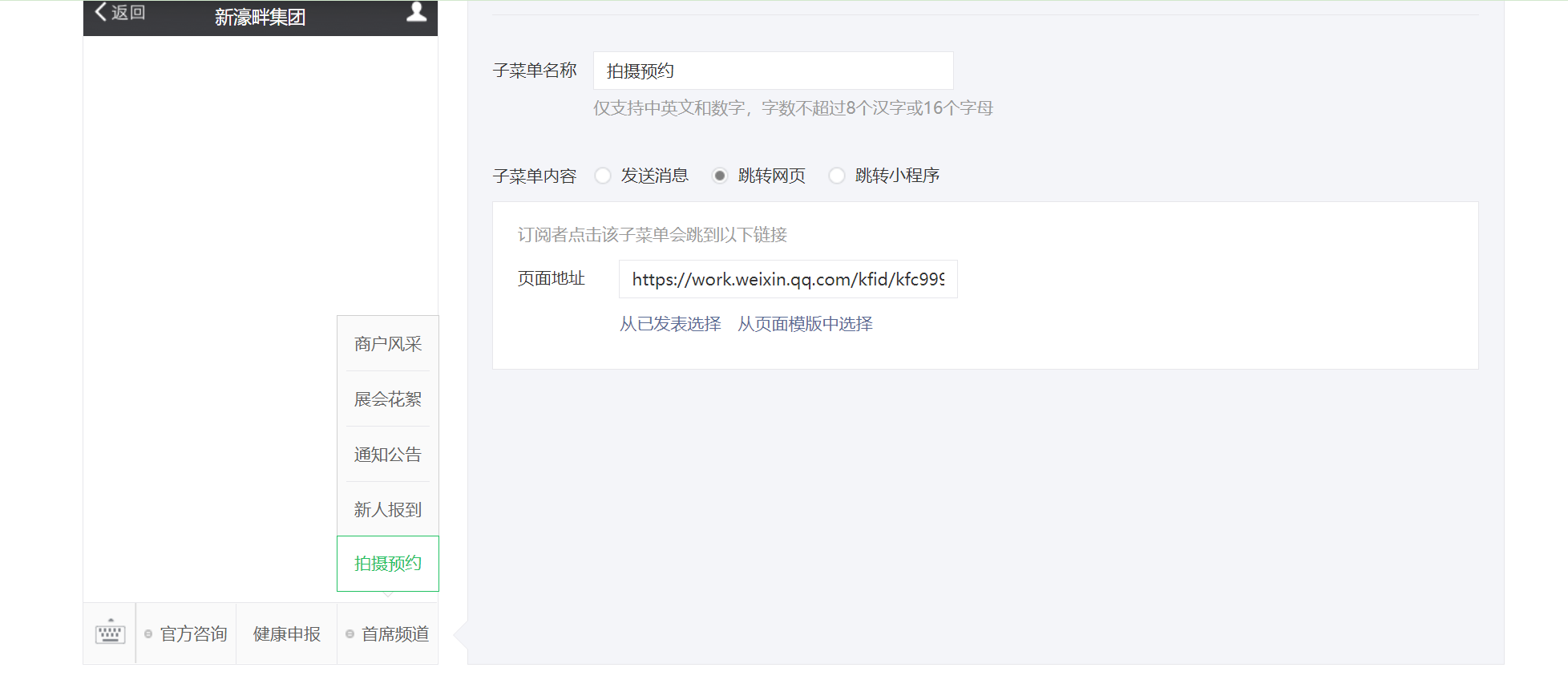 【页面链接】: https://mp.weixin.qq.com/advanced/selfmenu?action=index&t=advanced/menu-setting&token=534649920&lang=zh_CN