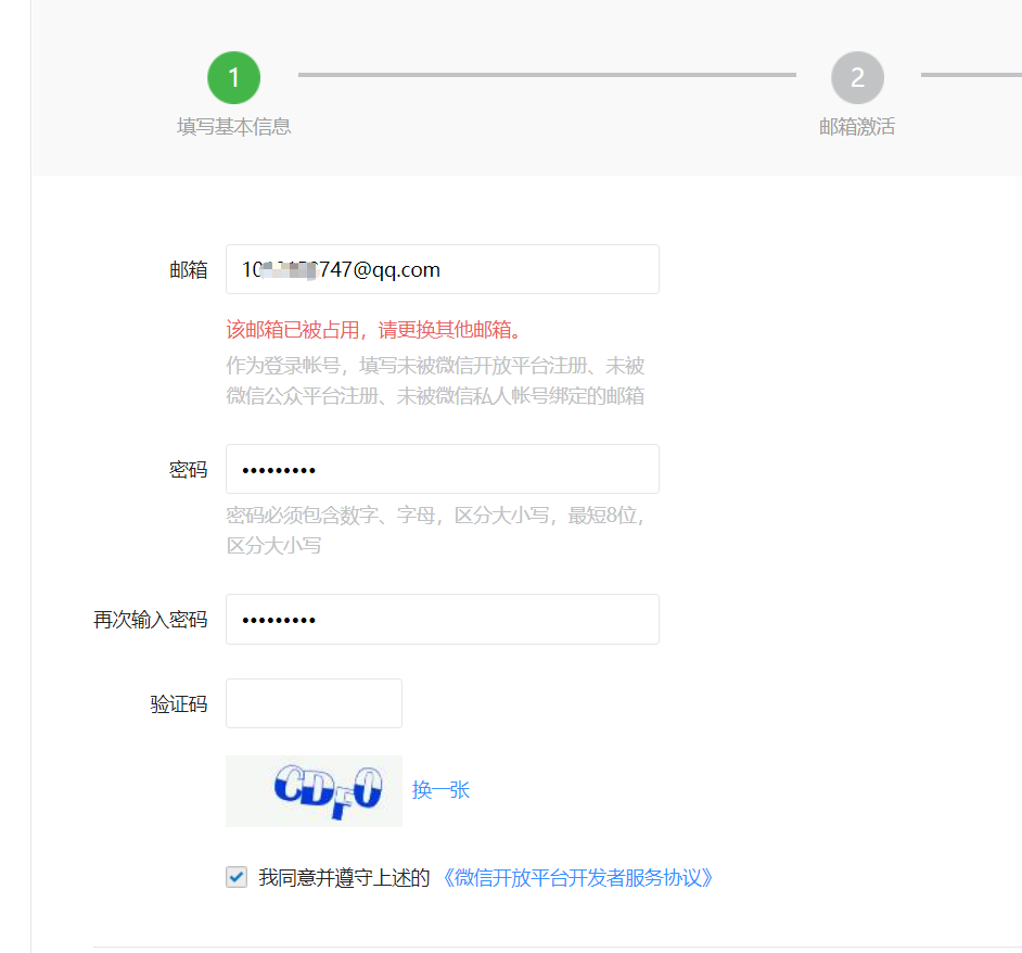 注:同一个邮箱只能绑定微信产品的一种账号,您可以尝试解绑或修改绑定的邮箱后再用于注册。