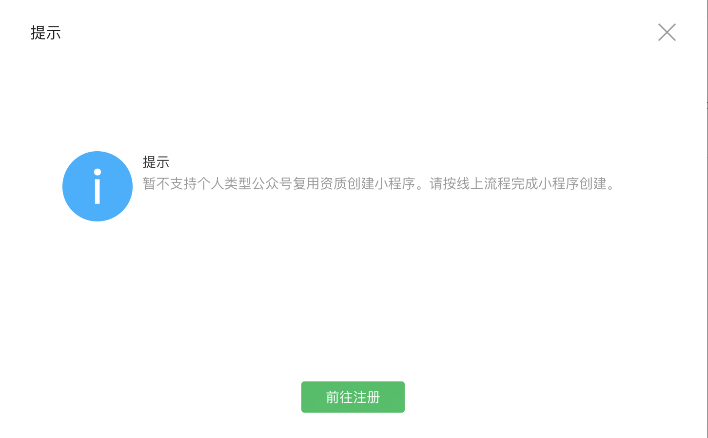 提示说的是注册小程序不能复用公众号资质的方式注册,直接登陆mp.weixin.qq.com注册小程序是可以的。