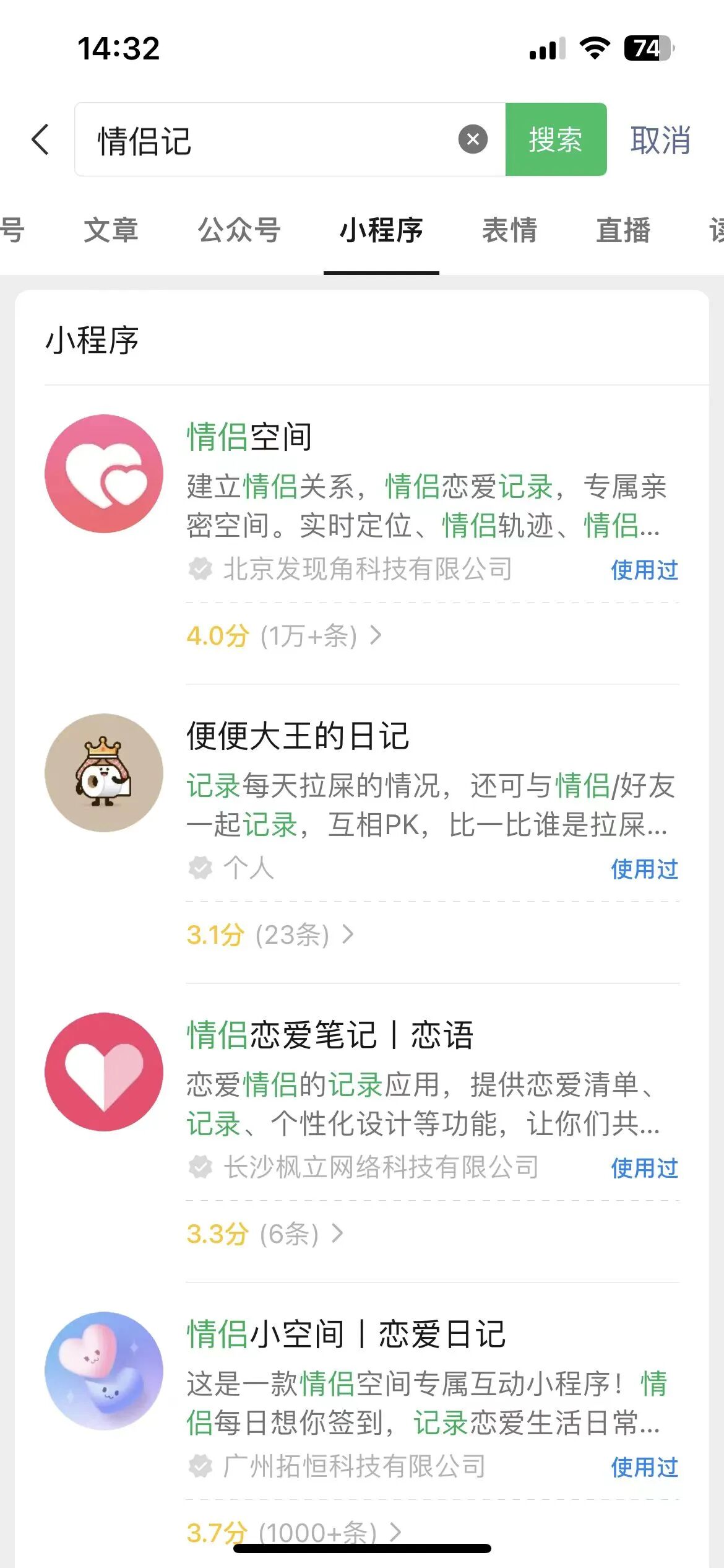 2、关于用户的搜索行为,我自己加了“情侣记”微信指数的数据,每天1万以上的精准搜索量,但是很明显搜索小程序返回的都是无关关键词,并且新注册的小程序还可以通过“情侣记”这个关键词被模糊搜到(图2中的第三个小程序),但我仅能通过精准搜索找到我的小程序。