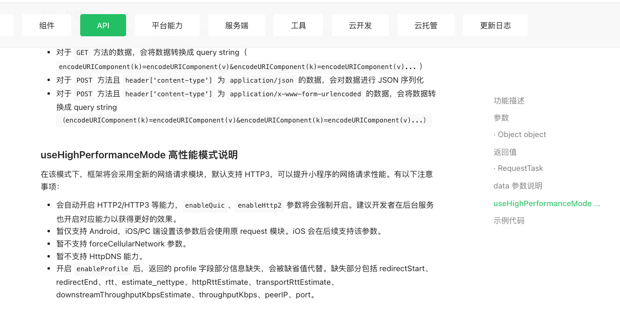 - 更新 API wx.request 接口新增 useHighPerformanceMode 参数 详情
