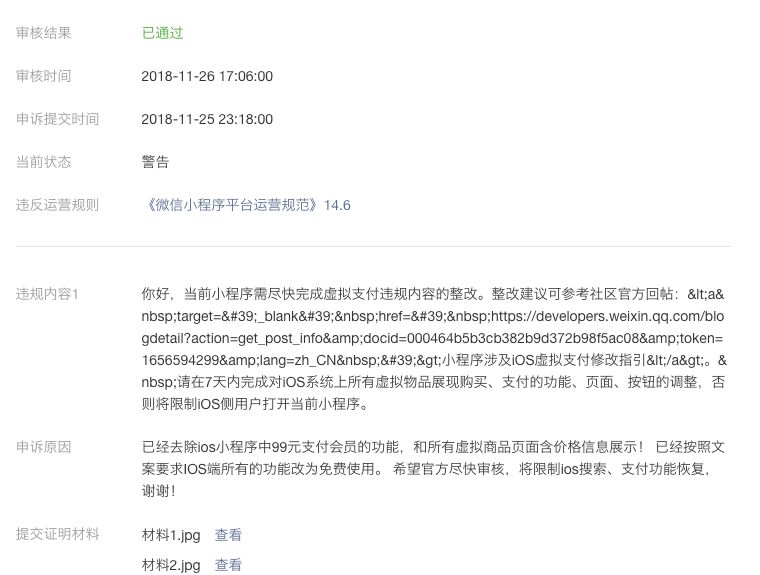 @官方 iOS虚拟支付二次审核修改完毕,现在警告已经解除,但是有一个没有通过审核