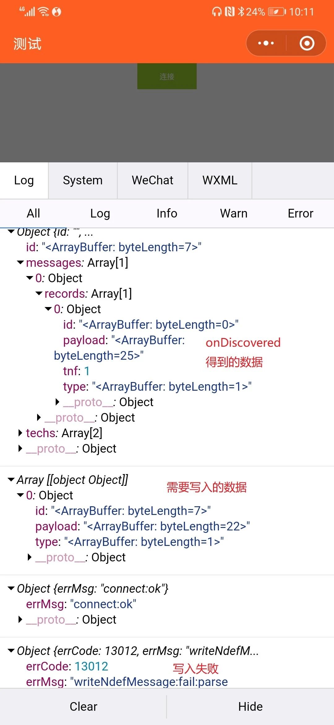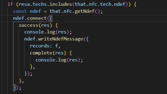 const string2ArrayBuffer = function(str) { // 首先将字符串转为16进制 let val = "" for (let i = 0; i < str.length; i++) { if (val === '') { val = str.charCodeAt(i).toString(16) } else { val += ',' + str.charCodeAt(i).toString(16) } } // 将16进制转化为ArrayBuffer return new Uint8Array(val.match(/[\da-f]{2}/gi).map(function(h) { return parseInt(h, 16) })).buffer } // tnf这个属性我是从onDiscovered的出参中发现的 const records = [{ id: string2ArrayBuffer('你要写入的id'), payload: string2ArrayBuffer('你要写入的信息'), type: string2ArrayBuffer('你要写入的类别'), tnf: 2 }];