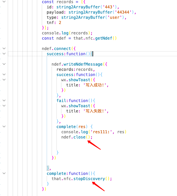 const string2ArrayBuffer = function(str) { // 首先将字符串转为16进制 let val = "" for (let i = 0; i < str.length; i++) { if (val === '') { val = str.charCodeAt(i).toString(16) } else { val += ',' + str.charCodeAt(i).toString(16) } } // 将16进制转化为ArrayBuffer return new Uint8Array(val.match(/[\da-f]{2}/gi).map(function(h) { return parseInt(h, 16) })).buffer } // tnf这个属性我是从onDiscovered的出参中发现的 const records = [{ id: string2ArrayBuffer('你要写入的id'), payload: string2ArrayBuffer('你要写入的信息'), type: string2ArrayBuffer('你要写入的类别'), tnf: 2 }];你好,需要自己明确下,自己具体要写入什么数据;