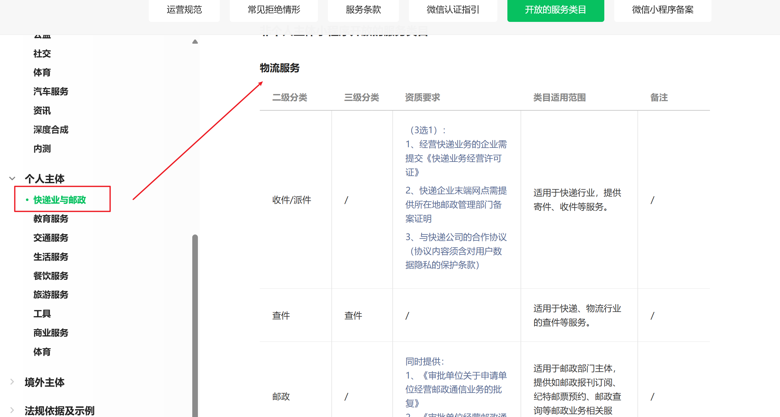 左侧导航栏,点击“个人主体”下的“快递业与邮政”跳转到的是非个人主体下的内容