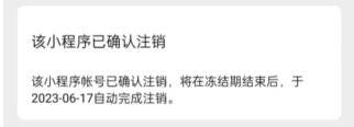 温馨提示:已发布的小游戏冻结期为30天,普通小程序、未发布的小游戏冻结期为7天。