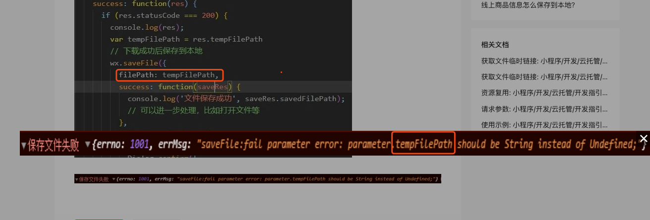 提示是 tempFilePath 参数不能为 undefined,你没有传这个参数哦。