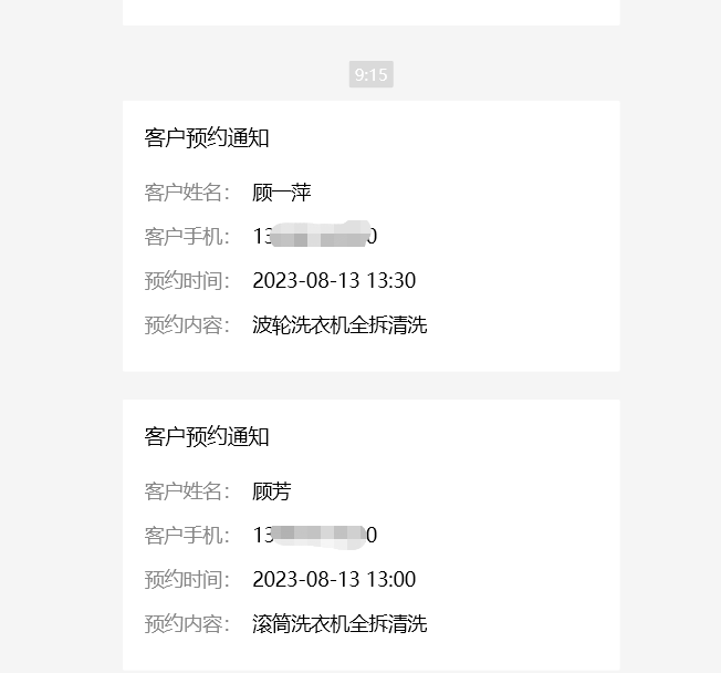 请求数据:{"first":{"value":"你的店铺泰富颐护家有新的预约"},"keyword1":{"value":"周汝英"},"keyword2":{"value":"1"},"keyword3":{"value":"2023-08-14 09:30"},"keyword4":{"value":"油烟机全拆灶具清洗"},"remark":{"value":"请及时处理。"}