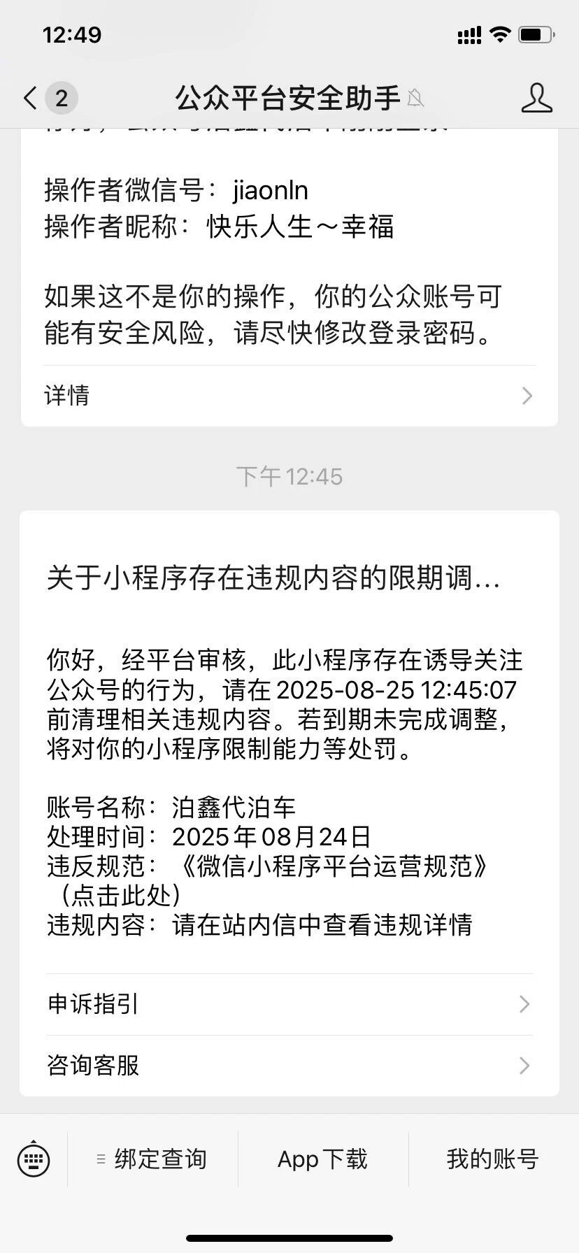 因为小程序辛辛苦苦花好多钱做了小程序 没有通知。通知不好用,交了300白瞎。我们为了不让小程序白瞎就转公众平台了。结果说我们小程序存在诱导关注公众平台,小程序不能用我们已经放弃了。不是诱导。这样吧周一我们推一下款吧。我们不用小程序了。谢谢您。