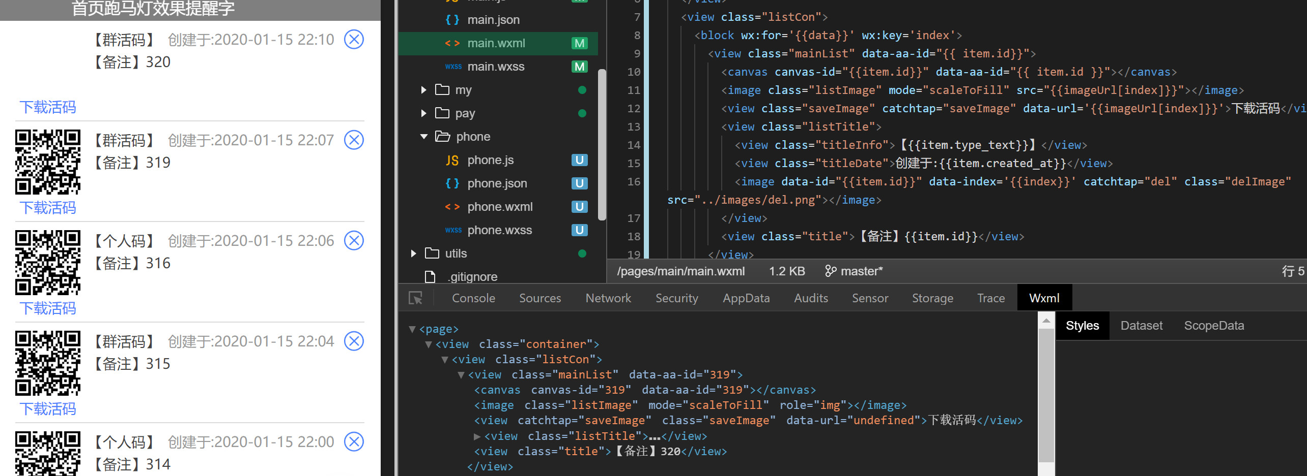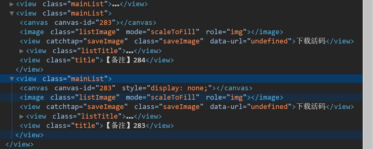 循环生成二维码列表,列表页绑定的是tabbar页面,初始进入无问题,操作后列表中新加入一个元素,重新渲染会出现一个重复的canvas并且自带style=‘display:none’