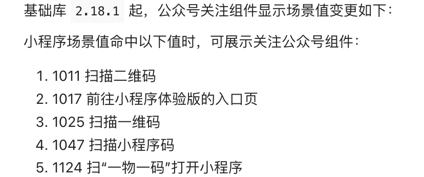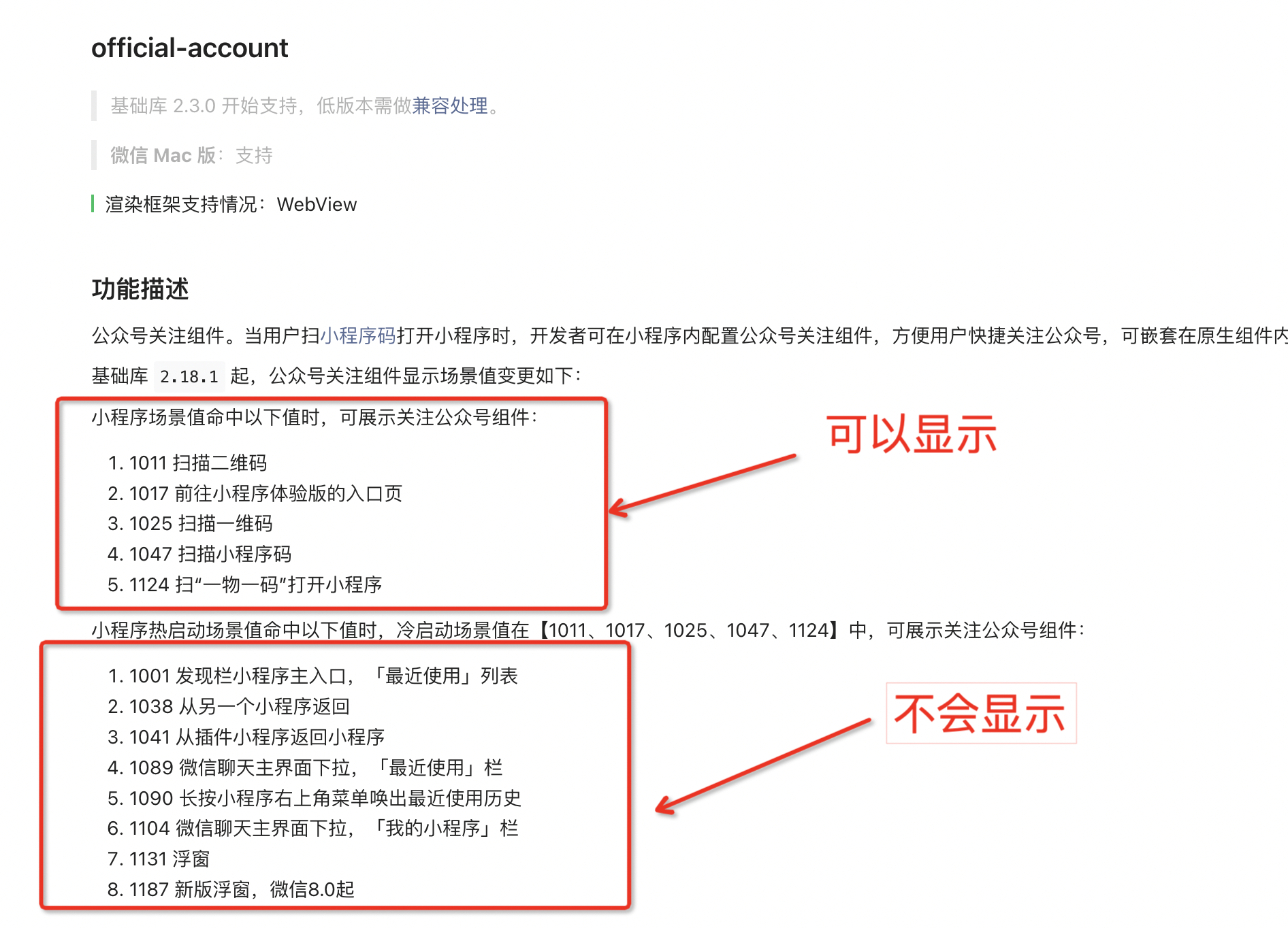 这个组件官方系的扫码和冷热启动场景都可以触发显示关注公众号组件的,实际上却只有扫码的场景才可以,冷热启动不行的,有人知道怎么回事吗?