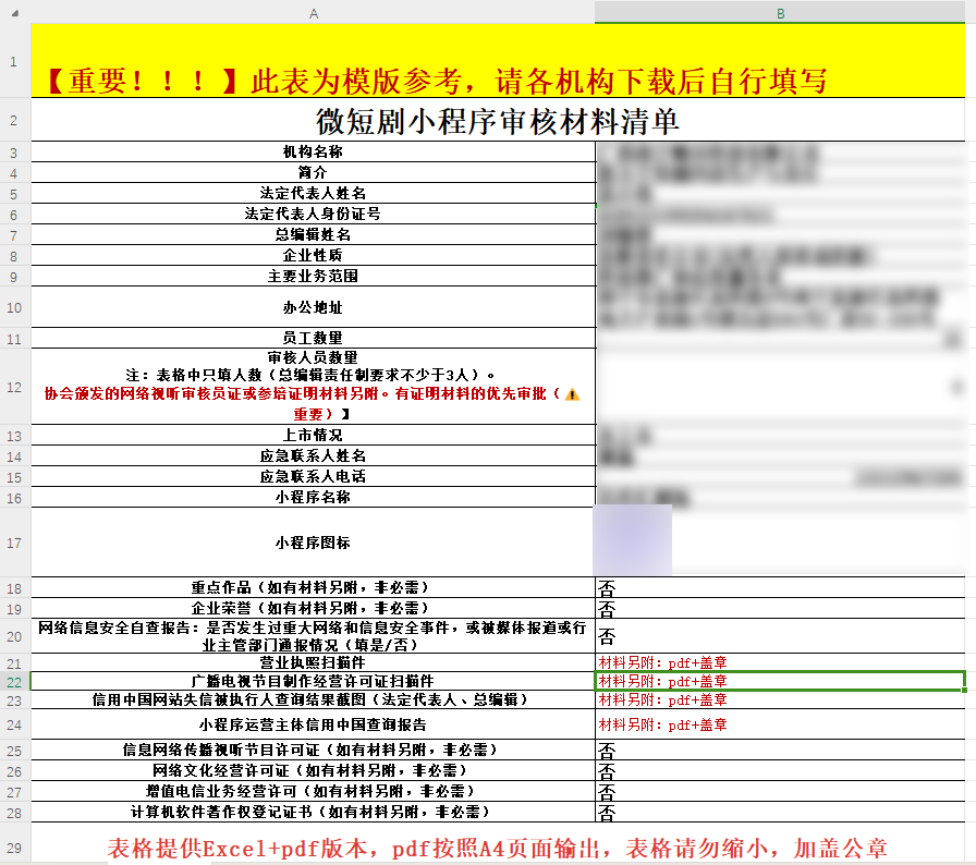 2、请重新提供正确的《微短剧“小程序”信息登记表》1.2 (excel文件)及《微短剧“小程序”信息登记表》1.2(pdf扫描件+加盖公章)。注:请勿调整表格行头项及格式 。