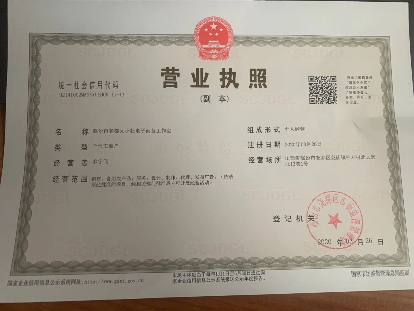 个体工商户:临汾市尧都区小壮电子商务工作室