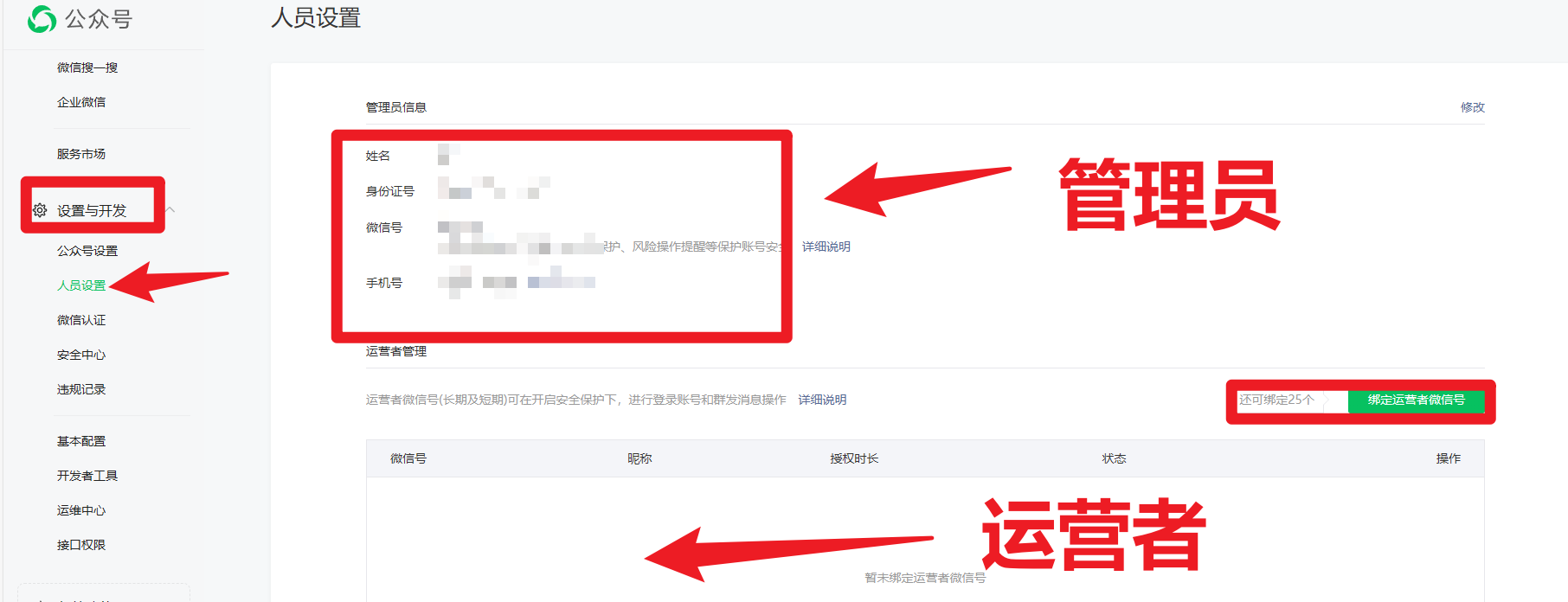 1、每个公众号只能有1个管理员,管理员可操作添加绑定5个长期运营者、20个短期运营者。