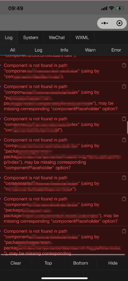 通过埋点观测这些异常情况,均有和wxs相关的报错,部分还伴随着component not found的报错: