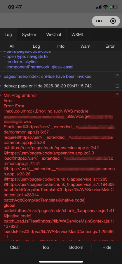 同时建议其他开发者如果有用到wxs,在这个问题修复前不要发版,异常命中率还是比较高的(因为这个问题用户白屏吃了通报....)