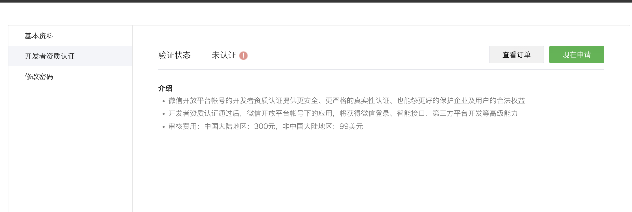 开放平台的认证是需要交300元/次的审核费用的,你可以去个人中心看下是否认证了呢?