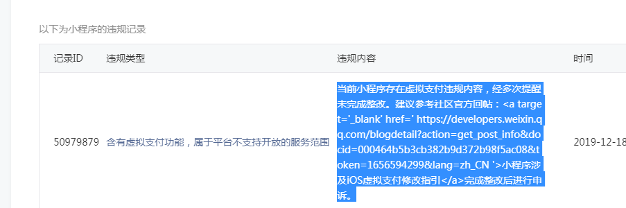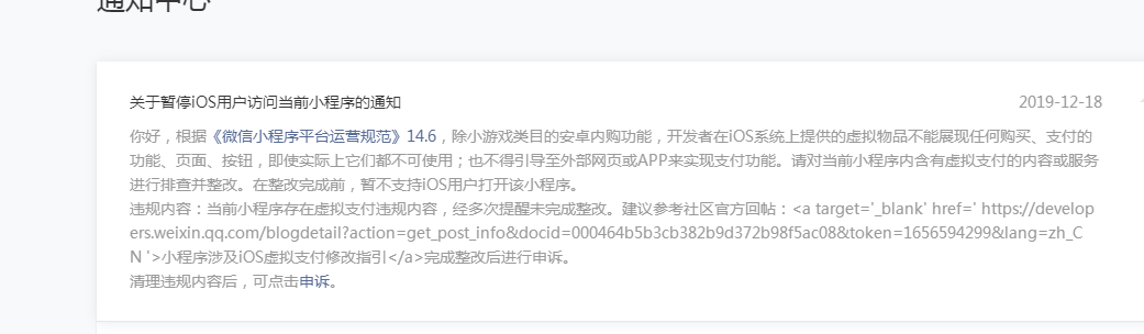 当前小程序存在虚拟支付违规内容,经多次提醒未完成整改。建议参考社区官方回帖:<a target='_blank' href=' https://developers.weixin.qq.com/blogdetail?action=get_post_info&docid=000464b5b3cb382b9d372b98f5ac08&token=1656594299&lang=zh_CN '>小程序涉及iOS虚拟支付修改指引</a>完成整改后进行申诉。