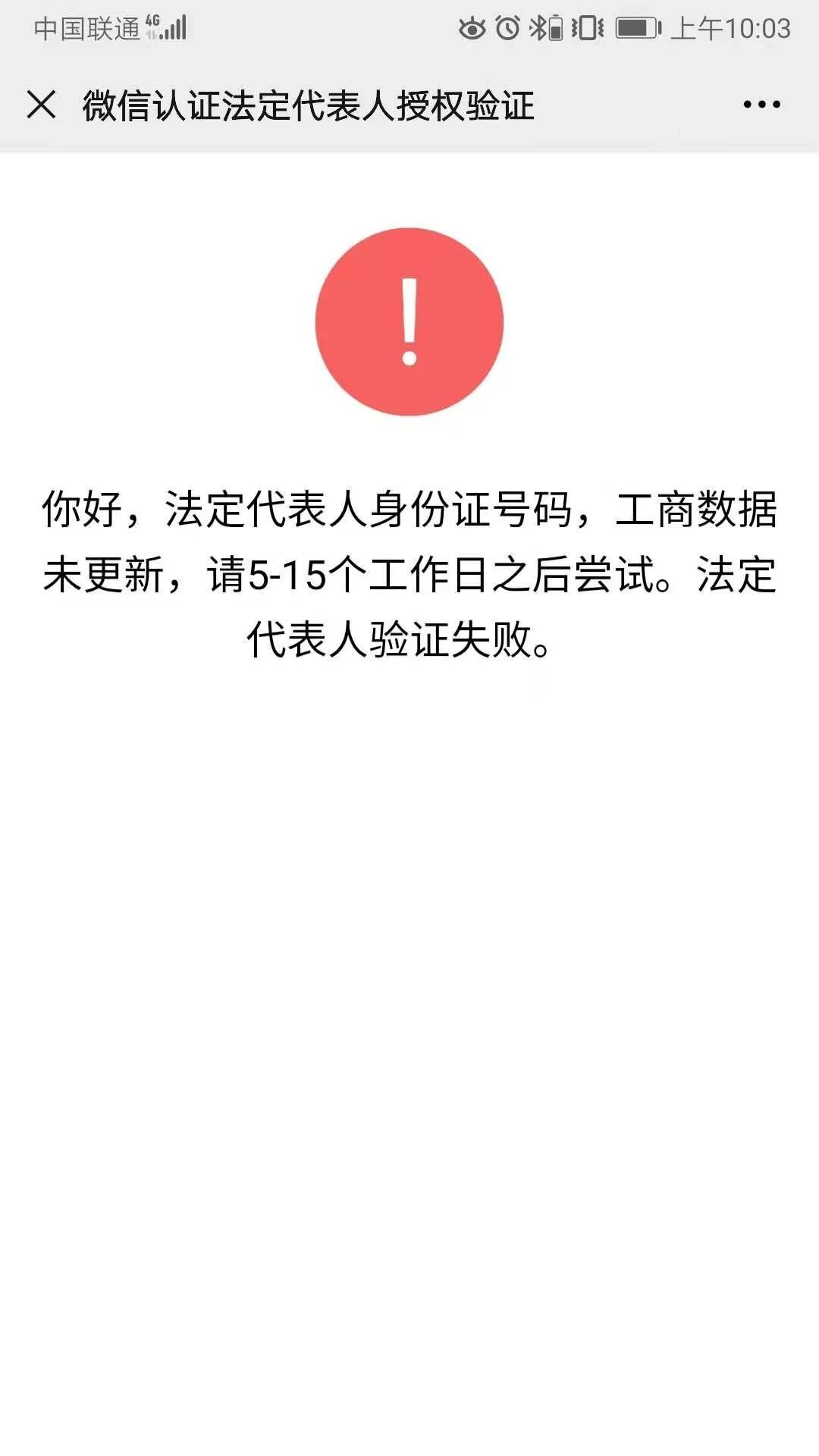 微信服务号认证个体工商户申请公众号认证提示工商数据未更新等待5-15工作日,但是营业执照都办下来3个月了