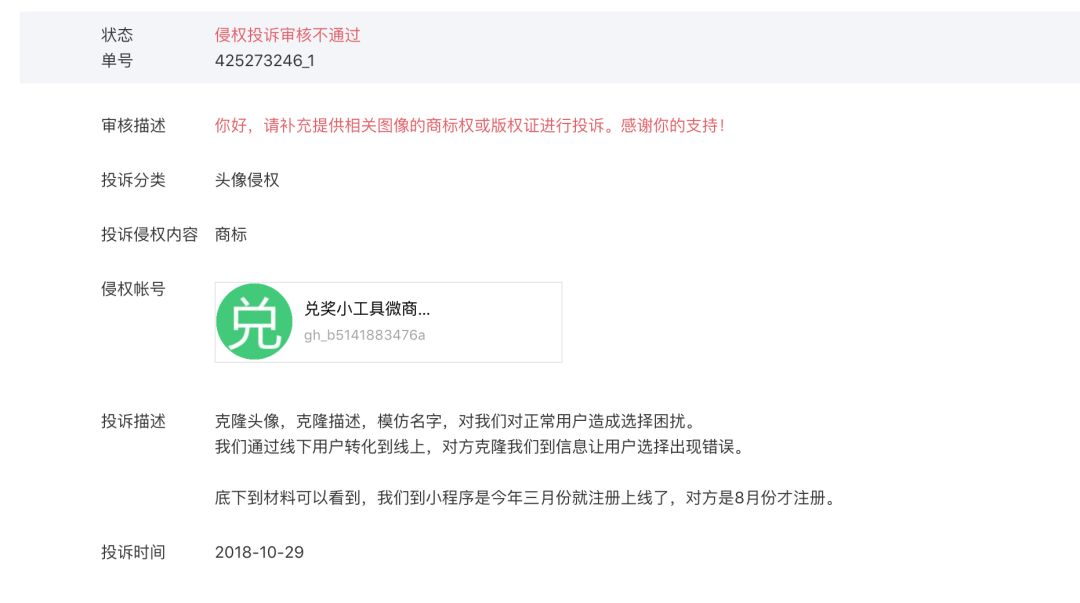 侵权投诉流程严格按照法律流程建立,需提交充足的证据材料,由法务团队来专业评估。 小程序侵权投诉指引可参考: http://kf.qq.com/faq/170222yqAbqi170222faeErI.html