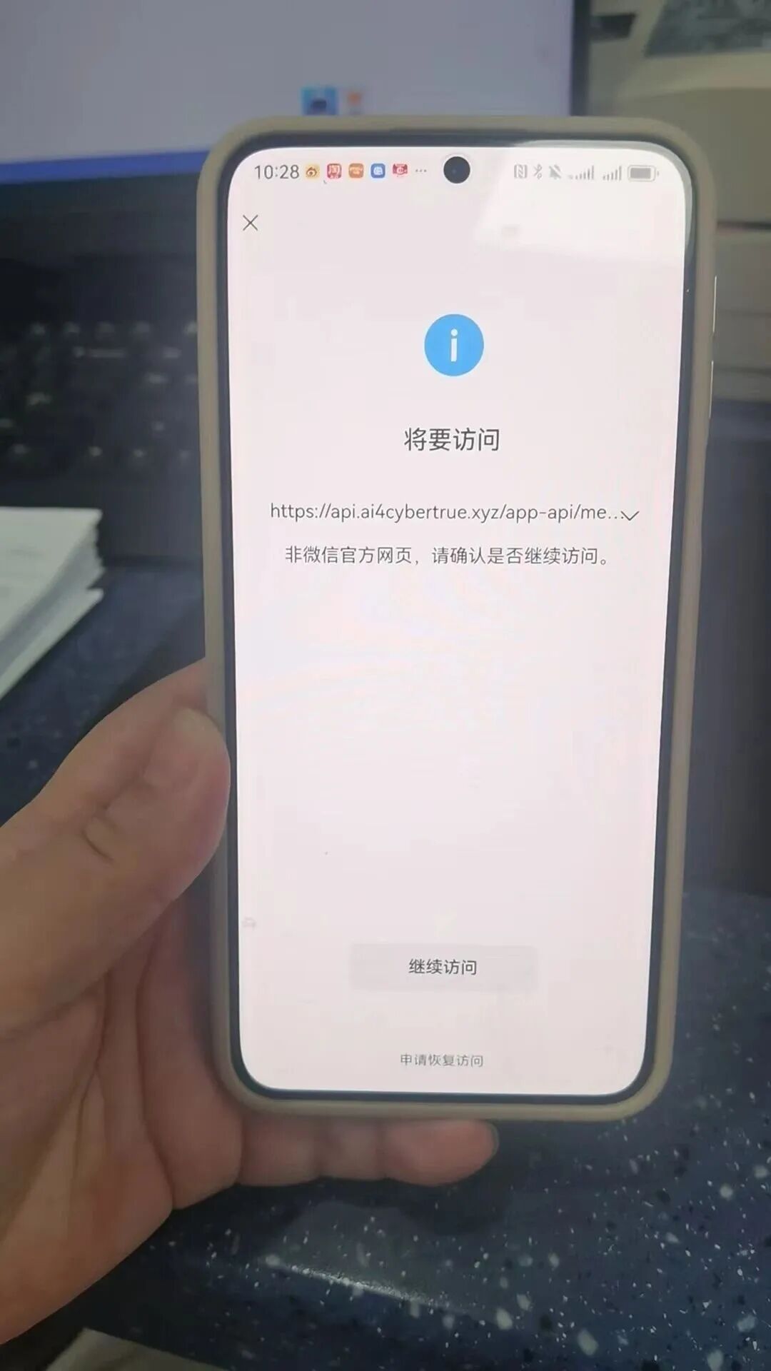 你好,经审核,域名【api.ai4cybertrue.xyz】下的链接【http://api.ai4cybertrue.xyz:8012/Ai1XmB6UYO.html?d=DxsAHxlTTkIOAkVBHRBPDgMBWhwbAAYASQwaQF4dAAkIDhJAPSYEGyIgBQw5RlBaU1hBX1NYWF9RXEZBAh0MAQ%3D%3D】的内容严重违反《微信外部链接内容管理规范》的第19条“恶意对抗类内容”,不予恢复微信内直接访问的服务,请知悉;
