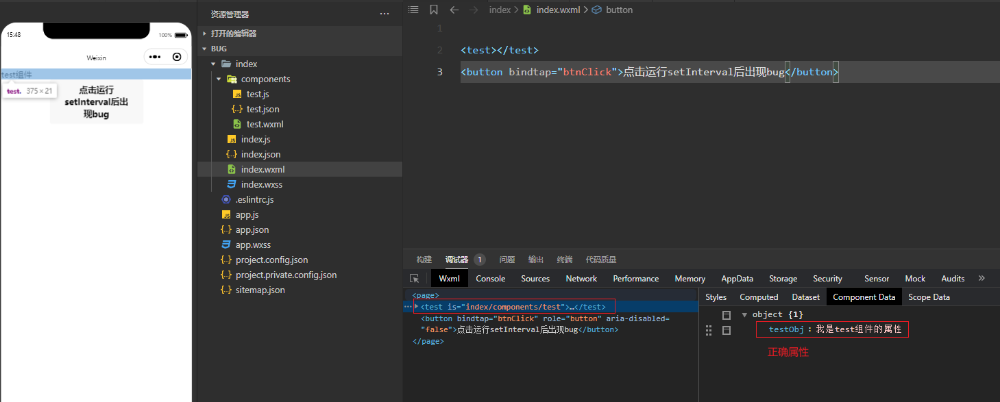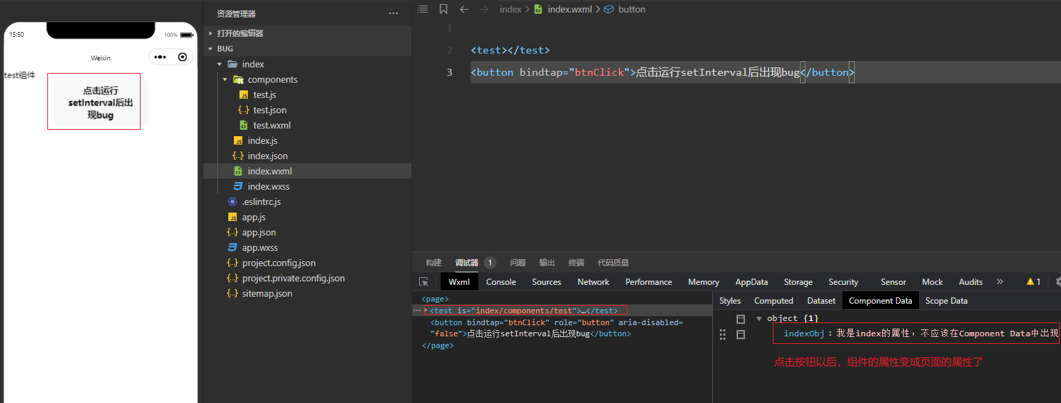 我的页面文件index有属性indexObj,组件文件有属性testObj