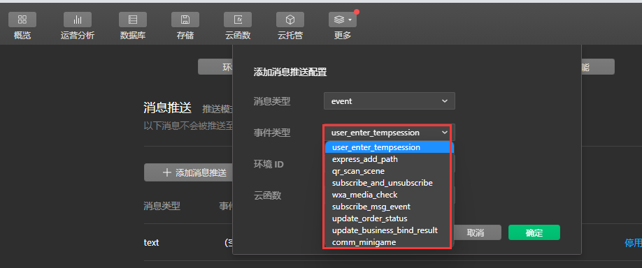 在上面文档中提到的道具发货协议,参数Event的取值固定为minigame_deliver_goods,但是在开发者工具-云开发-设置-其他设置-添加消息推送,消息类型选event,备选的事件类型没有minigame_deliver_goods。