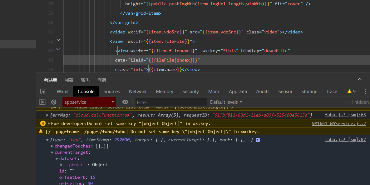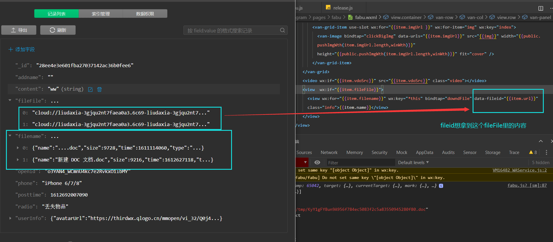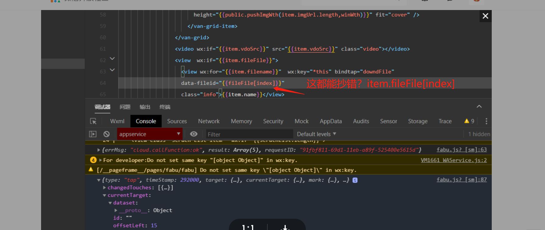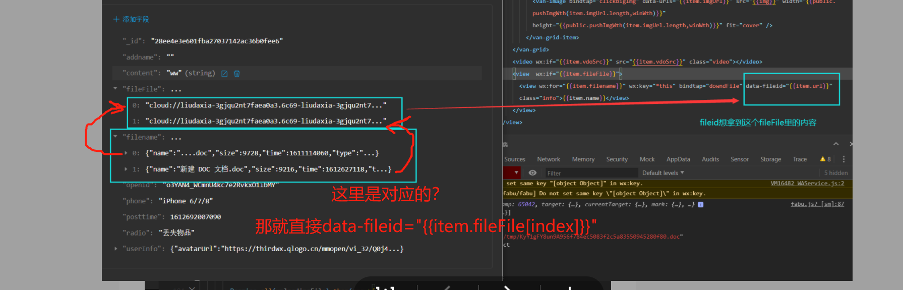 <view wx:for="{{array}}" wx:for-index="a" wx:for-item="b">{{a}}:{{b}}</view><!-- 如果不设别名,默认是 item.index --><view wx:for="{{array}}">{{index}}:{{item}}</view><view wx:if="{{item.fileFile}}"><block wx:for="{{item.fileFile}}" wx:key="*this" wx:for-item="fileFile"><view bindtap="downdFile" class="info">fileFile:{{fileFile}}fileFile:{{item.fileFile[index]}}filename:{{item.filename[index]}}</view></block></view>