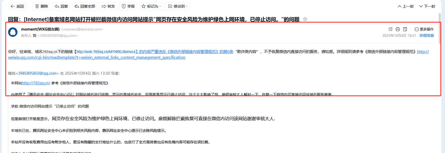 也使用了「腾讯安全-网址安全中心[6]」对网站域名进行检测,显示的是域名安全,但是就是显示已停止访问,这个大大影响了我,麻烦审核大人解封一下,恢复一下微信内可直接访问该域名服务谢谢。