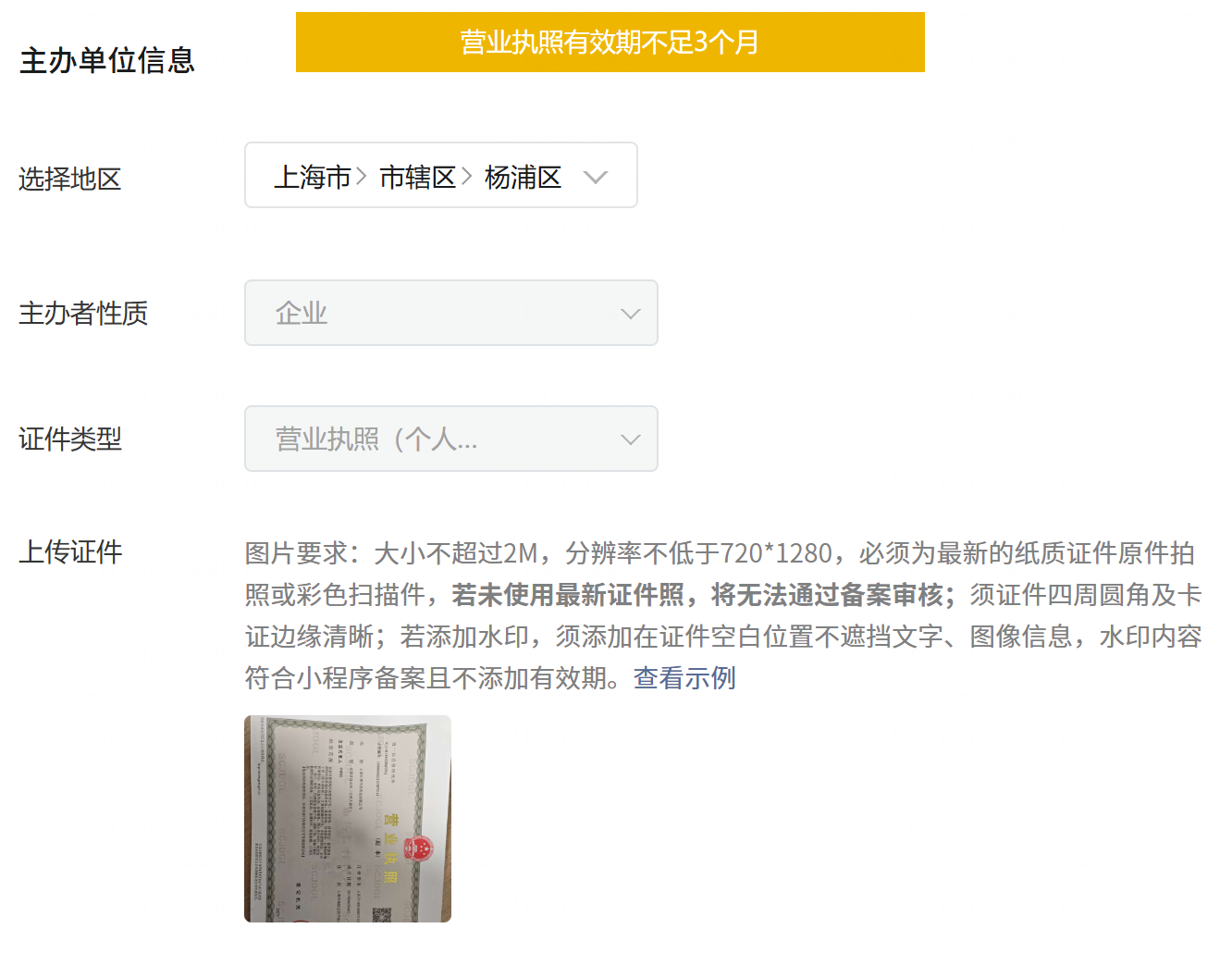 公司2015年成立,2025年3月换过一次营业执照,做小程序备案填主办单位信息时总是提示“营业执照有效期不足3个月”,没法进入下一步