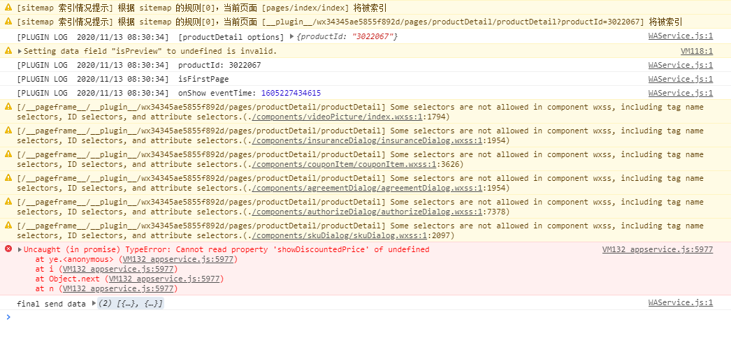 微信小商店版本1.1.7,小程序购物组件已开通,产品已上架,在模拟器中产品详情页总是加载失败,其他页面(订单,售后)可以正常加载,log显示错误原因“VM132 appservice.js:5977 Uncaught (in promise) TypeError: Cannot read property 'showDiscountedPrice' of undefined”,失败页面和log截图如下,谢谢!