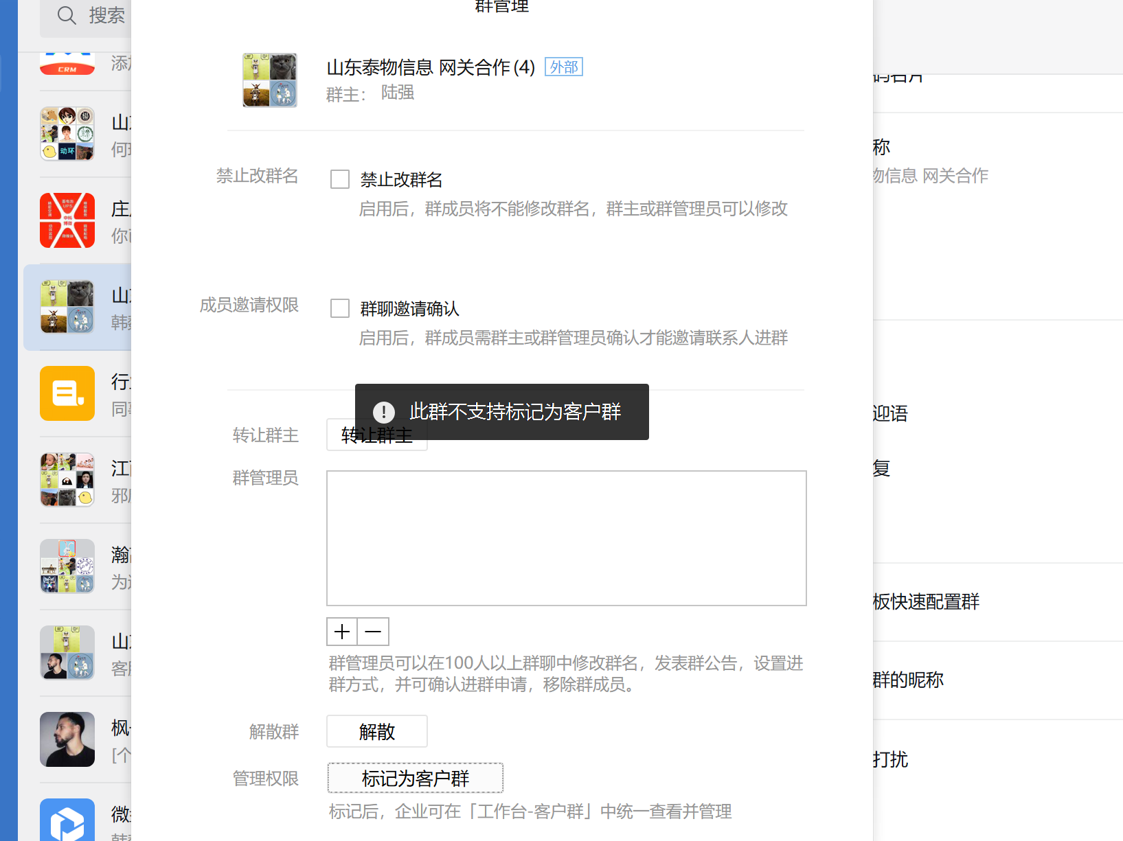 山东泰物信息技术有限公司,我们是物联网厂家,建群就是给客户提供解决方案 沟通交流,你们这么搞,原来的群给打成外部群,然后还不能统一管理,关键还转不回去,那你们开发这个吊毛功能干啥? 为啥要转群?聊天记录还是断的!原来的群翻记录,这边的群重新交流,我草你们这搞得啥啊?