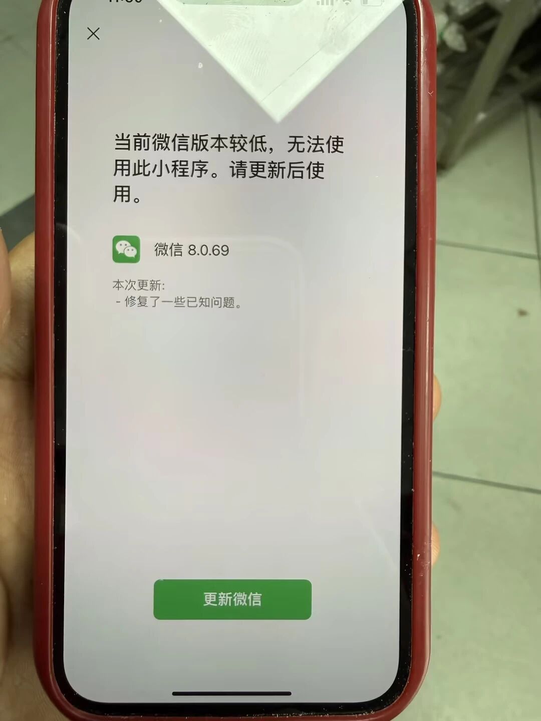 我这也遇到了,客户端版本是最新的8.0.69,但打开我们的小程序时,依旧提示客户当前微信版本较低,无法使用此小程序!我们是设置了小程序的最低基础库版本3.10.0,是需要很少数的用户更新微信客户端的。但你让用户把微信客户端升级到最新的,用户的已经是最新的了,还怎么升级?