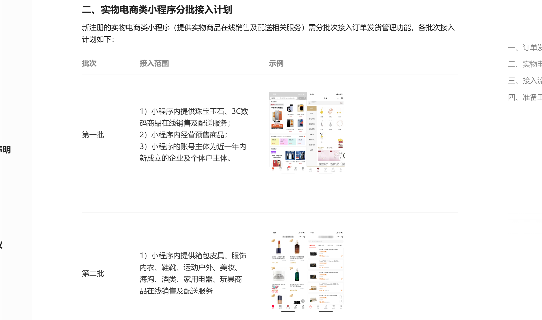 你好,提供实物商品(电商平台、食品饮料、数码3C、珠宝玉石等)或盲盒商品的在线销售及配送相关服务(包括但不限于物流快递、同城配送等方式)的小程序,均需接入平台订单发货管理功能。详情可参考《实物电商类小程序运营规范》
