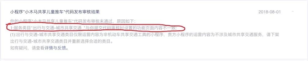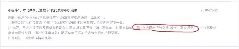 2. 在5月25日有一次小程序更新审核不通过,要求我们把服务类目改成“出行与交通-城市共享交通”,这一条应该是新加的类目,我们也认为非常符合我们实际业务。修改服务类目后审核通过。