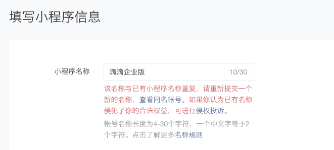 在同一主体下申请新的小程序时发现有重名账号,进行侵权投诉也被驳回。
