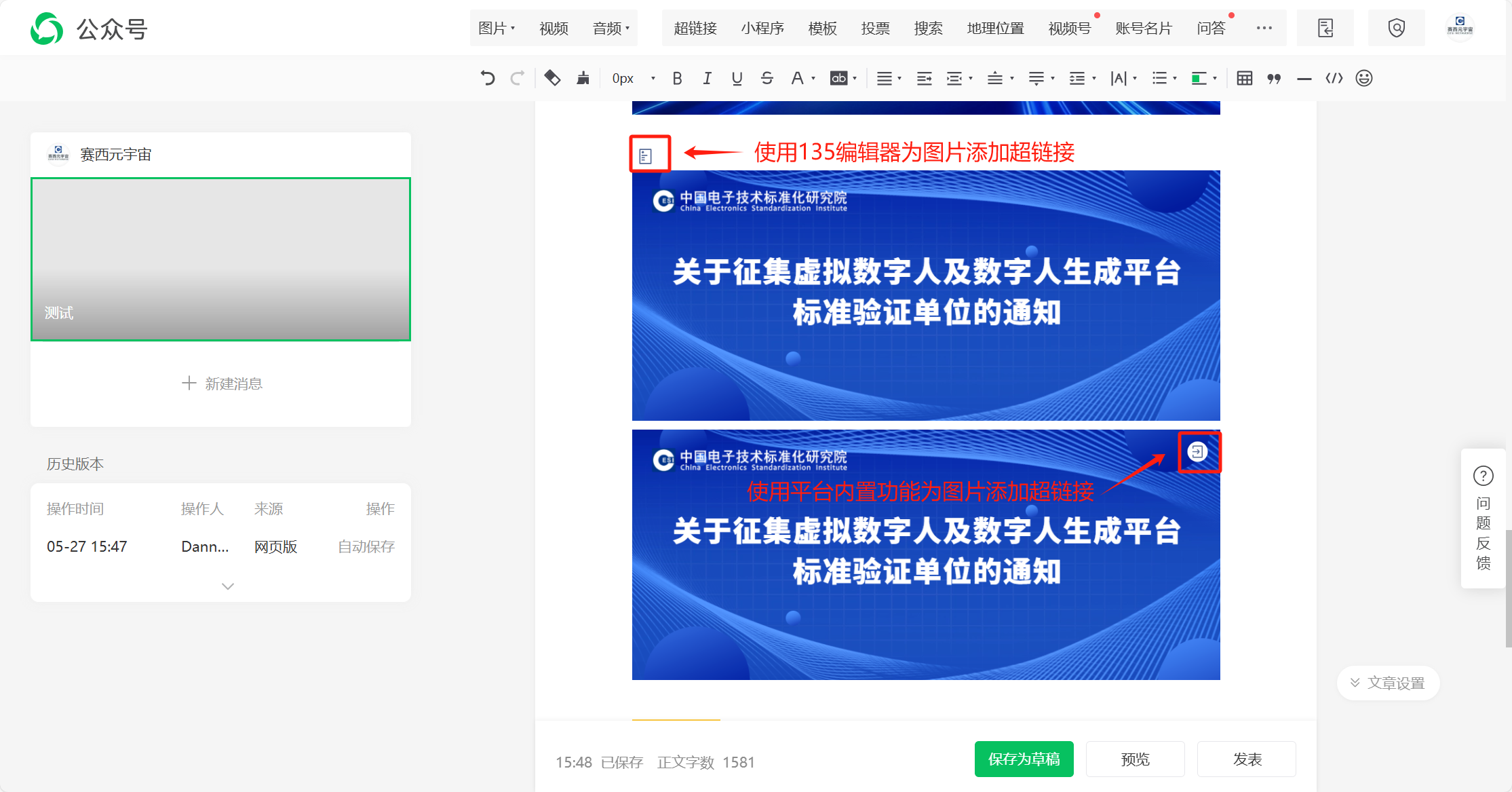 【问题描述】:使用135编辑器编辑微信公众号文章,为文章正文中的图片添加超链接,在编辑器中查看文章无问题,同步到微信公众平台后,每张图片外侧左上方都会多出一个SVG图标,文章本身是没有插入任何SVG元素的,这个SVG图标是微信公众平台给加上去的,用以表示点击该图片会跳转到其他微信文章。