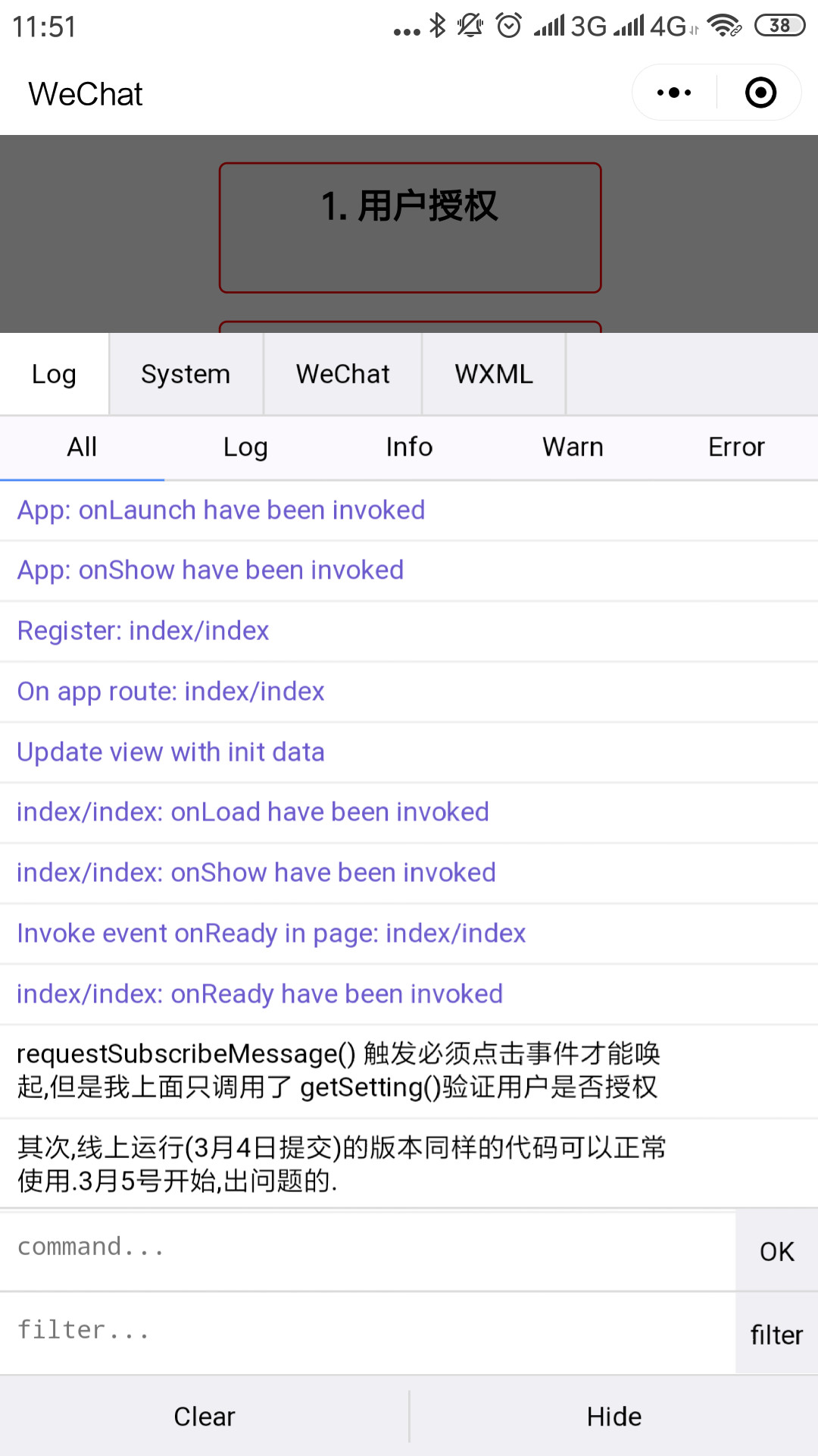 wx.requestSubscribeMessage() 调用前,调用 wx.getSetting() 检查用户是否进行了用户信息授权(仅对授权过用户信息的用户下发订阅消息)。然后抛出异常: