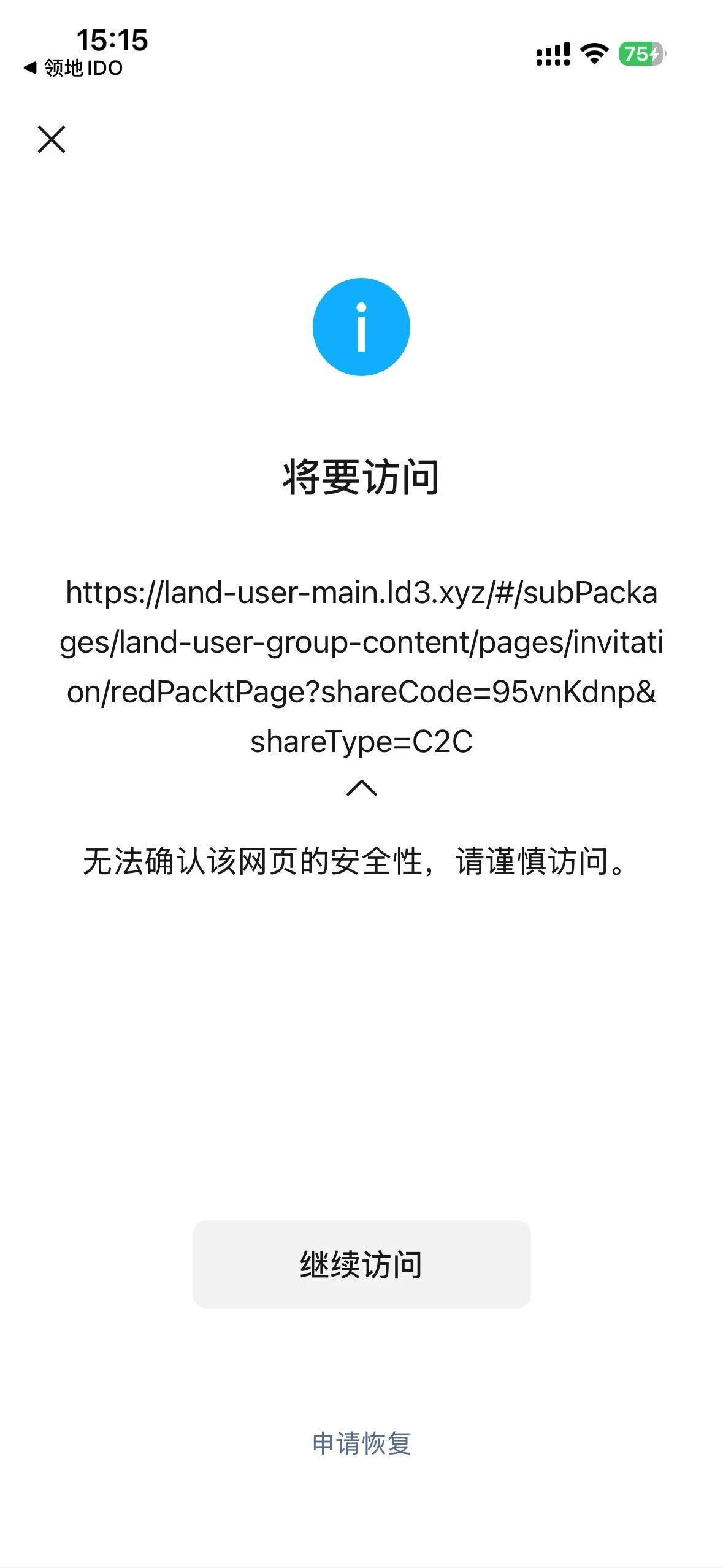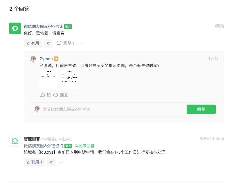 访问域名【ld3.xyz】提示“无法确认安全性”,申诉后官方回复已恢复,目前不存在违反微信规则的页面,但是访问时仍有该提示。