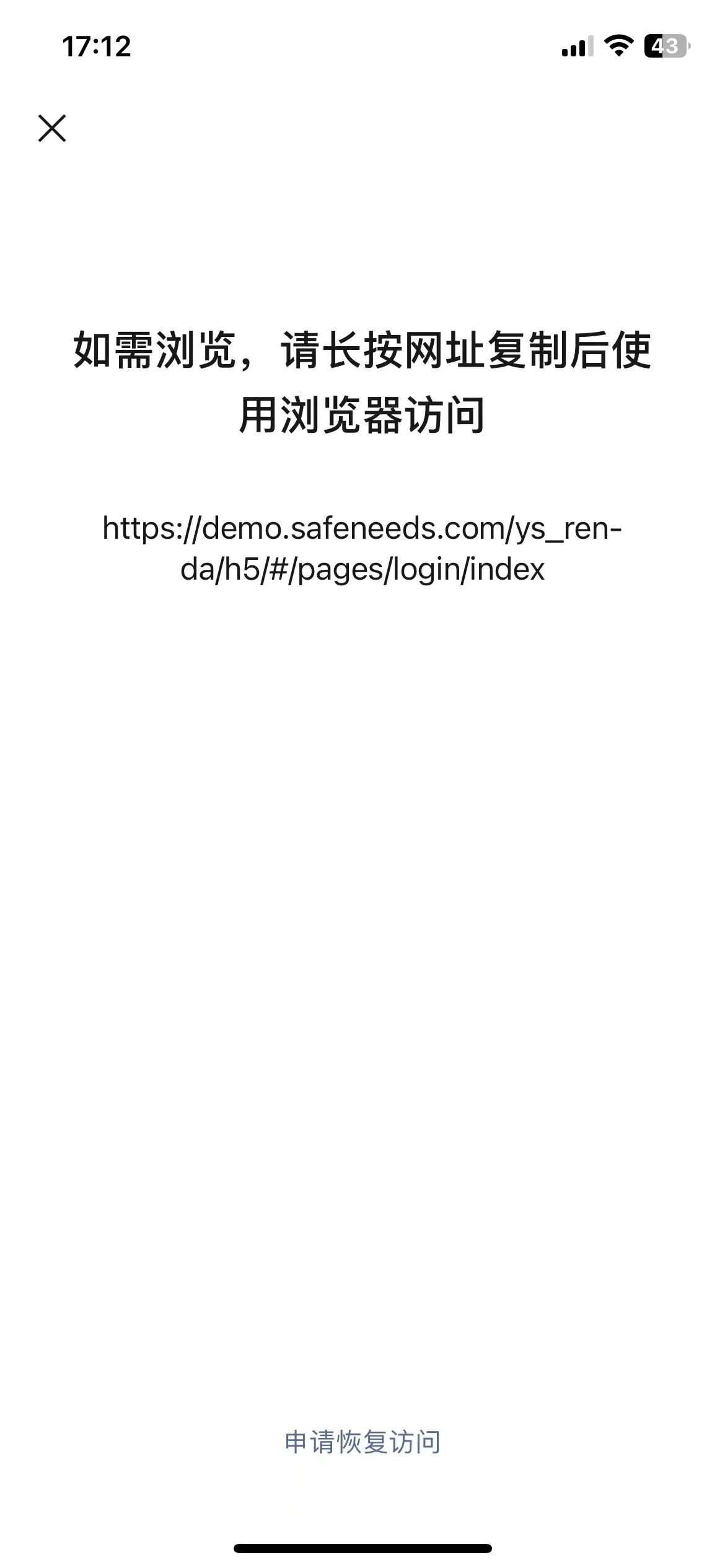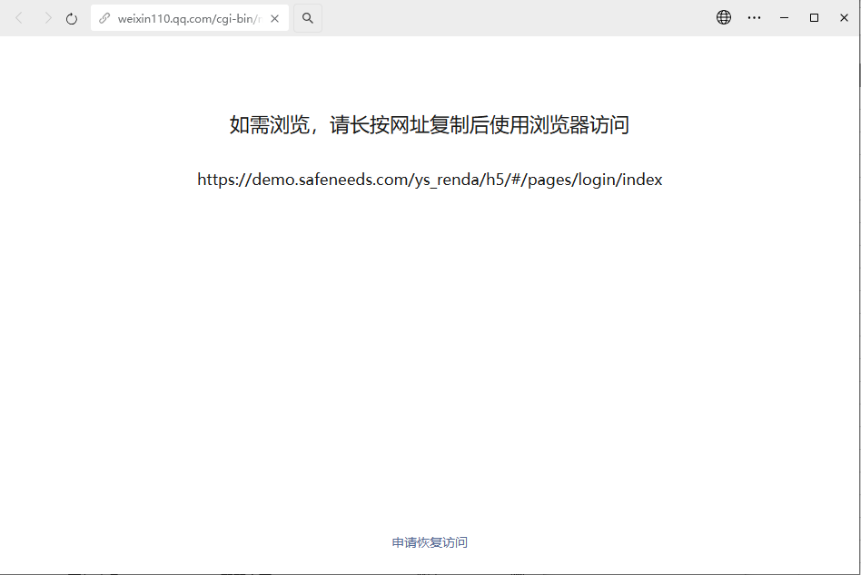我们公众号上面的域名是:demo.safeneeds.com , 从2026年1月初就开始出现了,我们的网页符合【微信外部链接内容和管理规范】,目前在腾讯安全网址安全中心检测也没有问题,已严重影响到我们公司的业务了。今天早上申述过,但是只是恢复了APP微信公众号内进入的入口,但是在PC端以及APP微信公众号进入的快捷入口处任然无法直接打开,麻烦处理下,谢谢