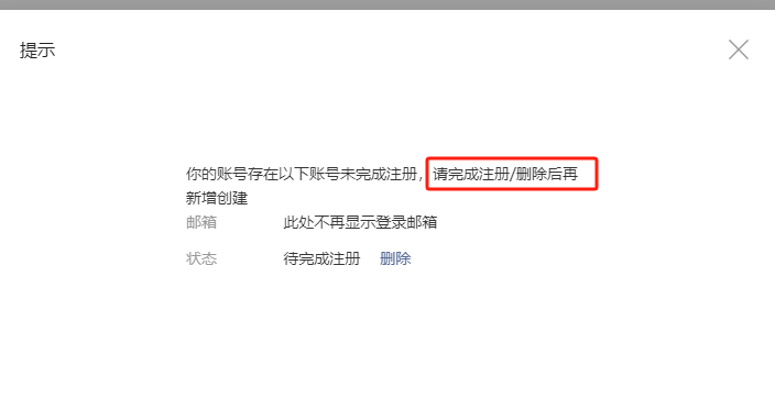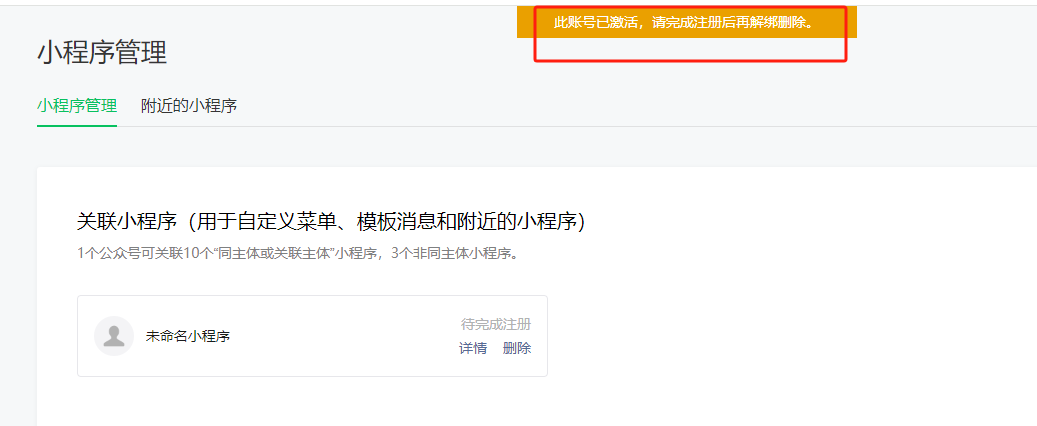 点删除,删除不了,提示“此账号已激活,请完成注册后再解绑删除”,如下图: