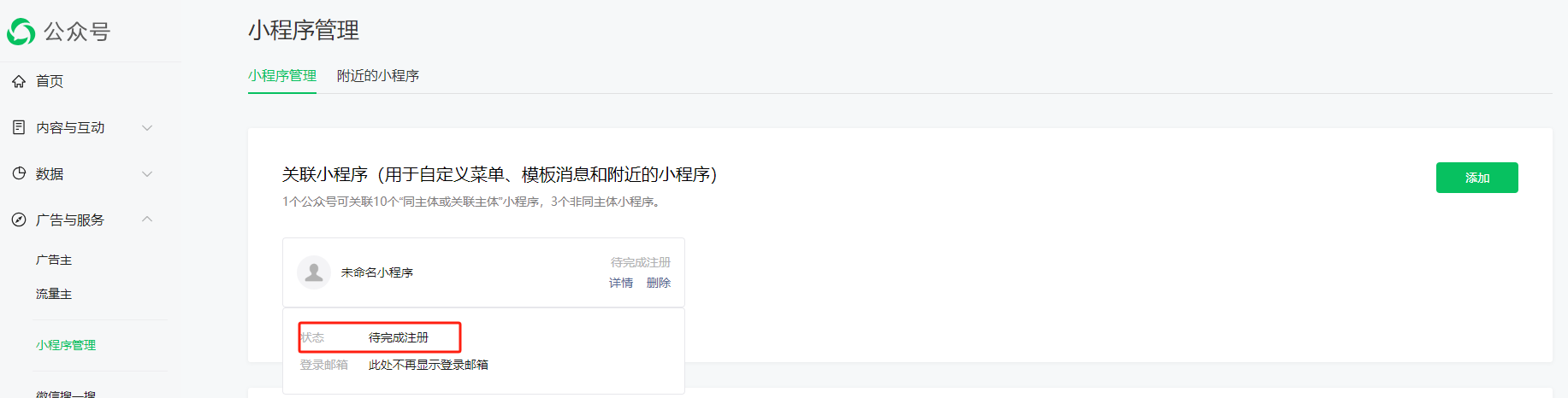 点击小程序管理,可以看到有这个未完成注册的小程序,点详情状态是“待完成注册”,但是没有继续填写的入口。如下图: