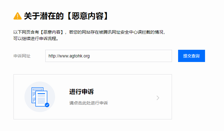 网站http://www.agtohk.org被微信拦截,未标注具体违规信息,烦请核实下当前网站是否符合规定,如不符合请告知具体违规信息,如已无问题,辛苦解封恢复下微信访问,谢谢!