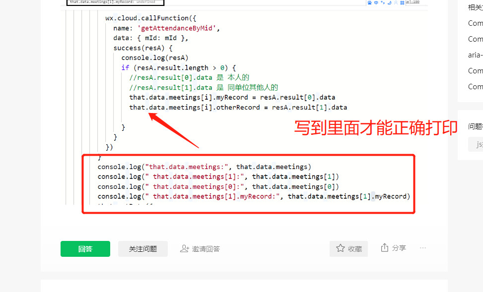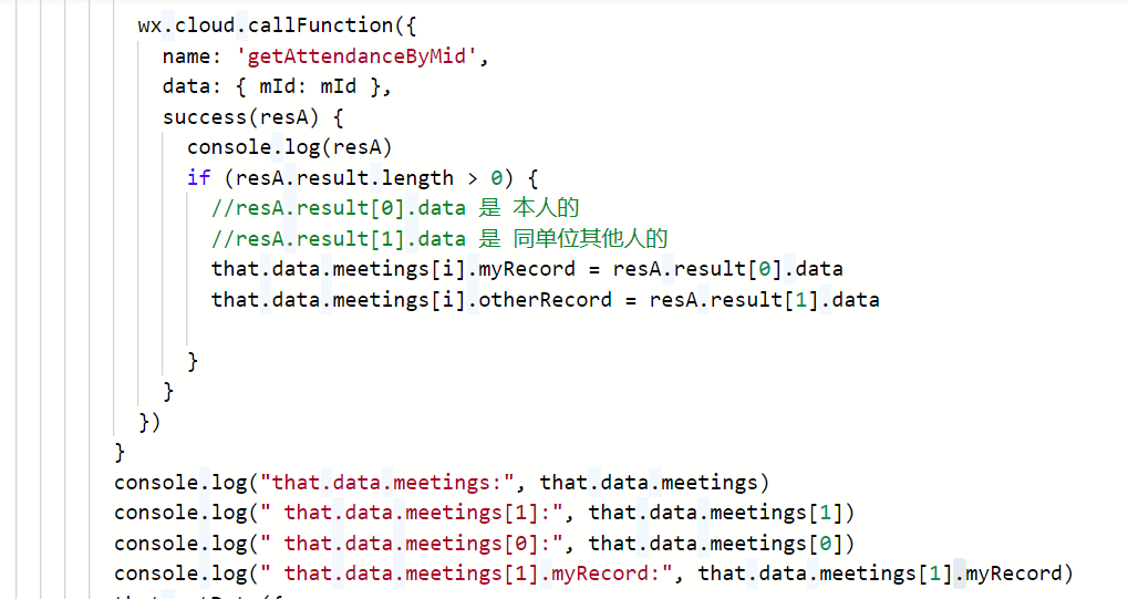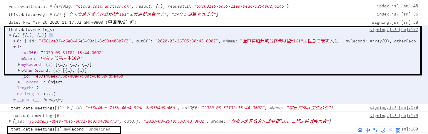 打印整个数组可以看到myRecord,otherRecord被添加进去了,但是通过that.data.meetings[1].myRecord访问却显示undefined