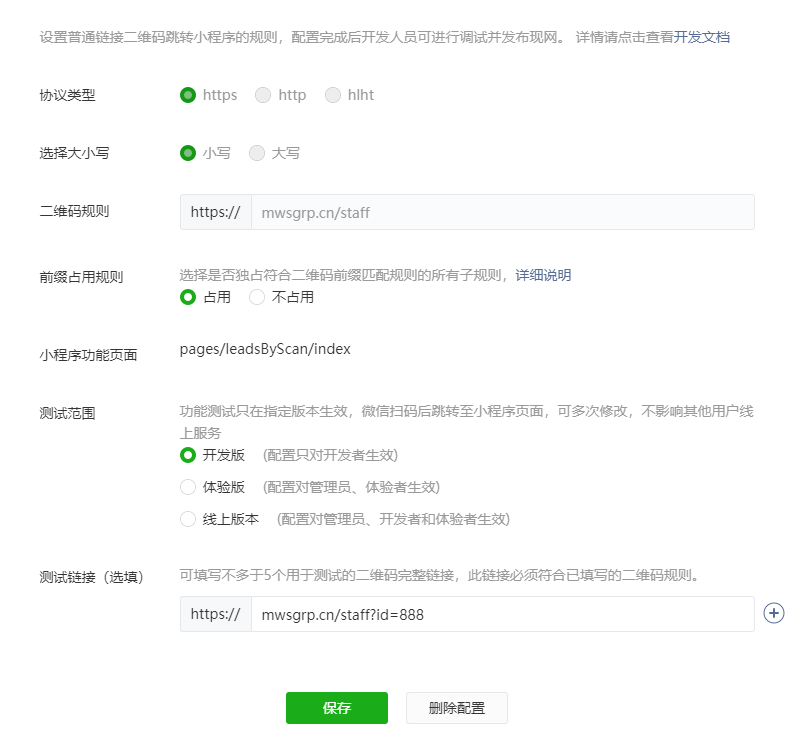 我在微信后台配置了普通二维码进入小程序和测试链接,但扫描后还是进入线上版本该如何处理?是我的测试链接与规则不匹配吗