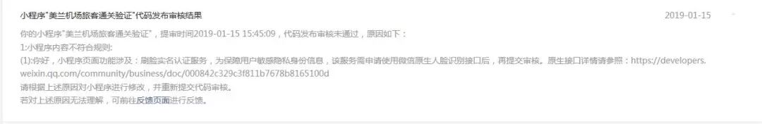 目前小程序流程已完成,在新一版本进行发布审核时。发现审核不通过。之前版本人脸审核是正常通过,并没有做接口上调整,只是进行了页面调整。
