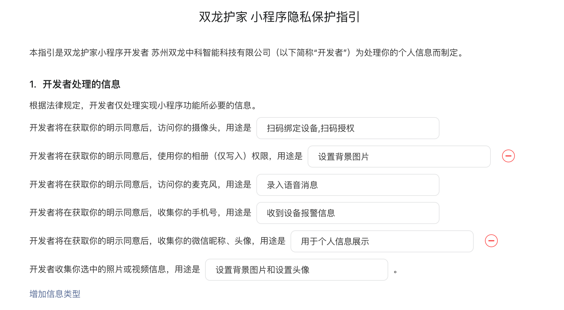 你好,你的小程序“双龙护家”用户隐私保护指引审核因用户信息授权描述不明确、不清晰,本次审核不通过,建议修改后重新提交。